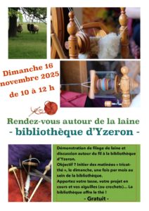 Dimanche 16 novembre, de 10h à 12h, découvrez le filage de laine à la Bibliothèque ! Si vous êtes intéressés, la Bibliothèque vous propose des matinées « tricot- thé », le dimanche, une fois par mois. Apportez votre tasse, votre projet en cours et vos aiguilles (ou crochets)... on vous offre le thé 🙂